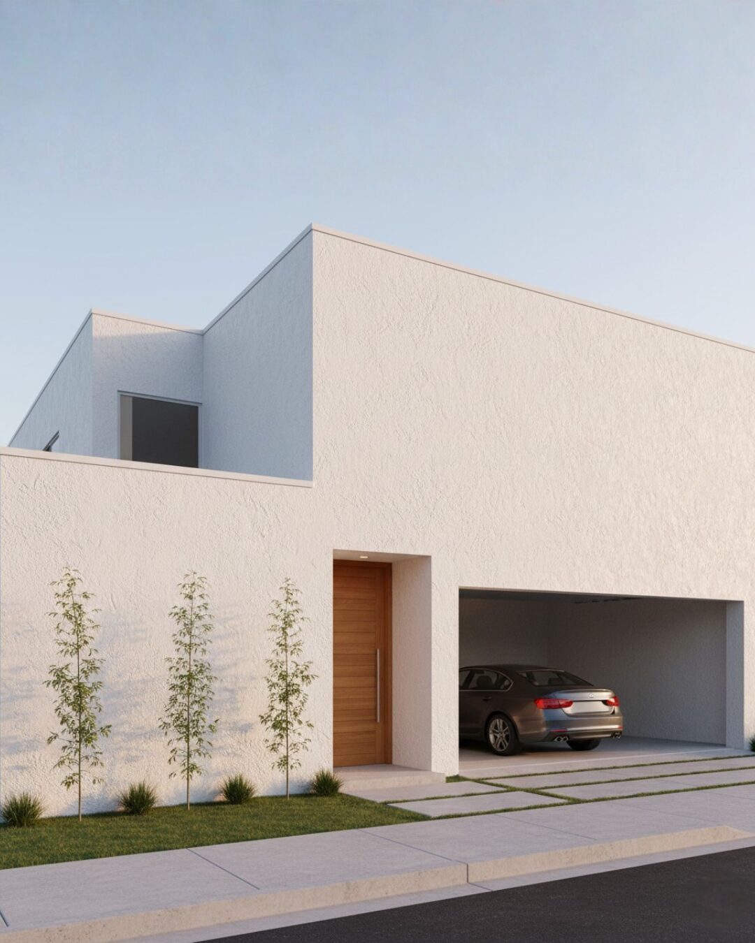 例えば、今回ご覧いただいた写真のような、ざらざらとした質感の白い外壁にミディアムウッドの玄関ドアを組み合わせることで、