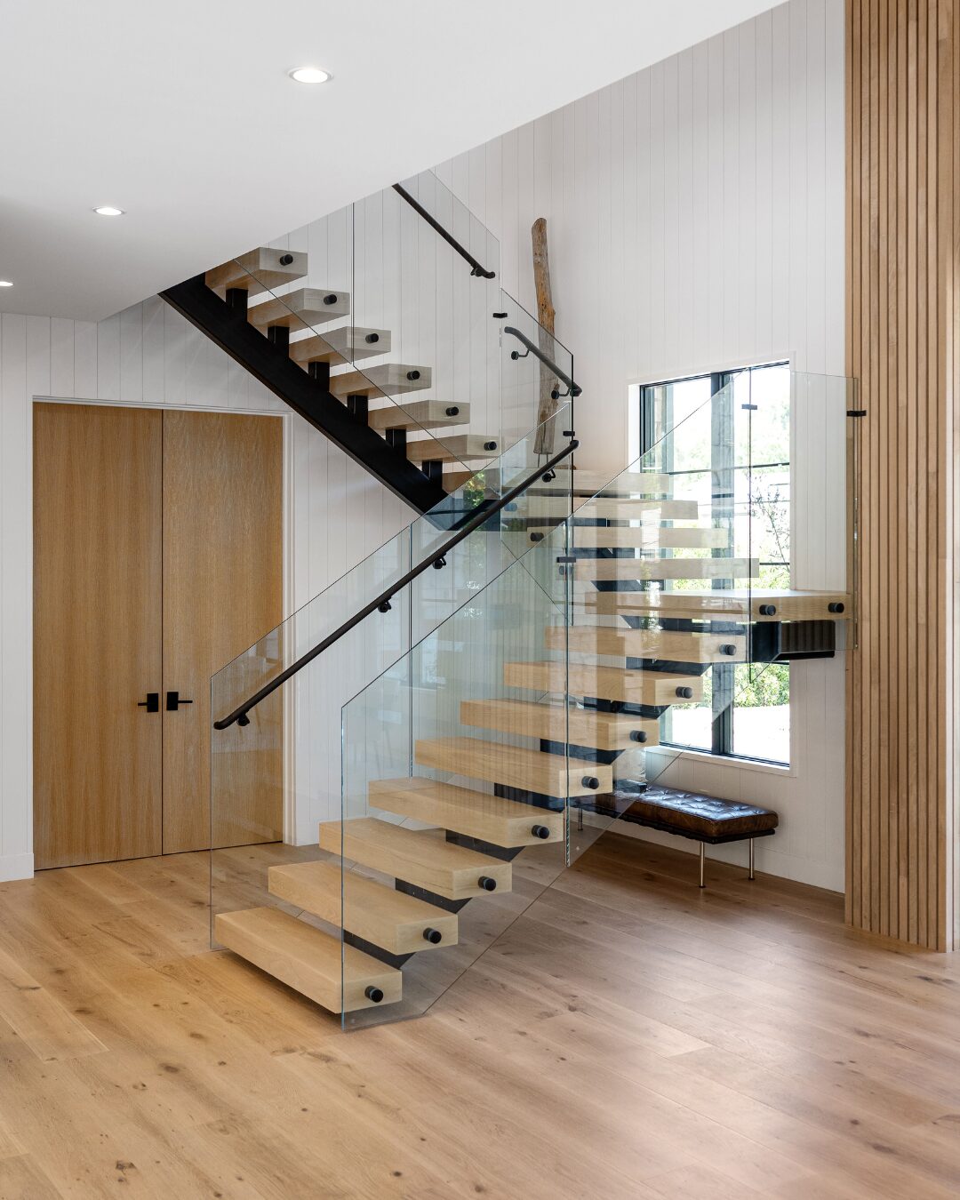 階段の側面にガラスパネルを設置することで、光が遮られず、空間全体に軽やかさと広がりを演出します。