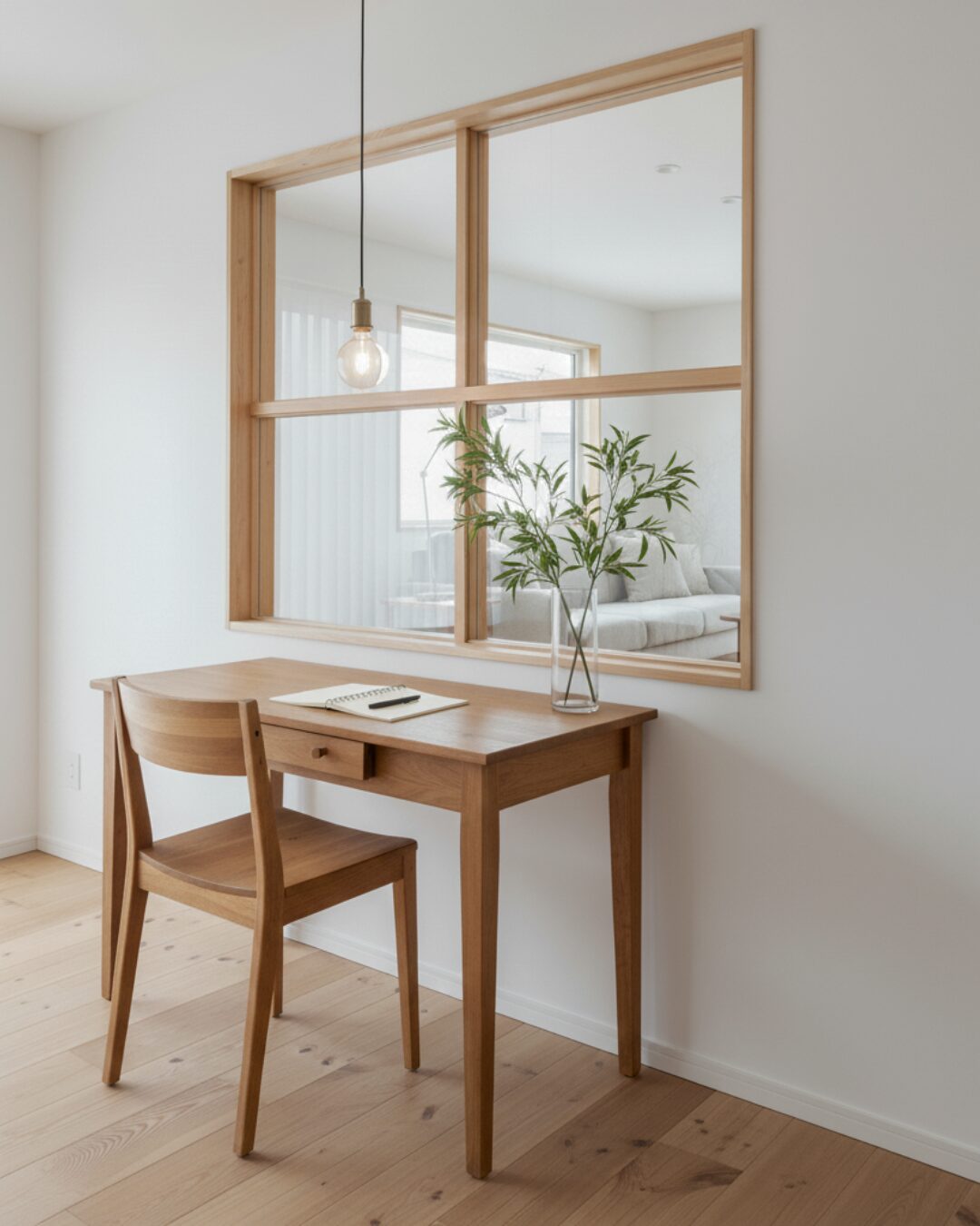リビングと繋がる室内窓を設けることで、自分の時間や仕事に集中しながらも窓越しにリビングの家族の気配を感じられる「適度な繋がり」を生み出します。