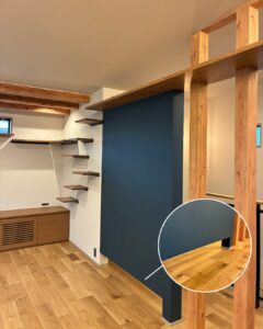 Point:ブルーのアクセント壁の足元には、こっそり「猫専用の通り道」を。