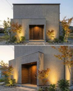 計算された光の配置が、植栽の影を壁面に映し出し、計算し尽くされた「静寂の美」を演出。