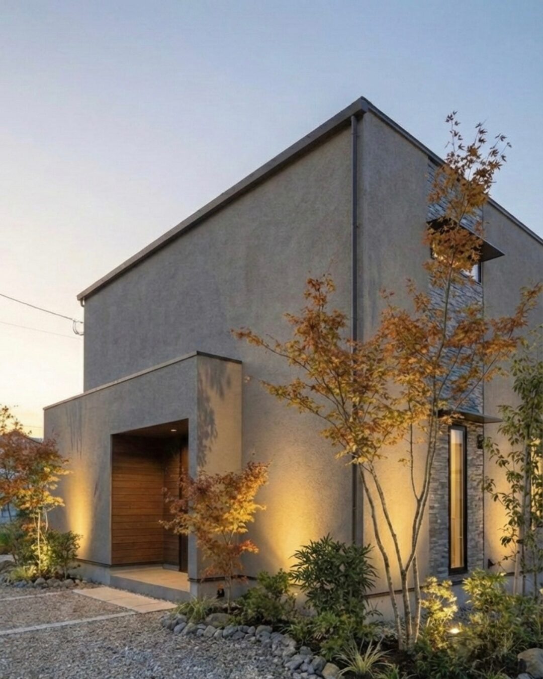 無機質でソリッドな質感のグレーに、玄関まわりへ贅沢にあしらった「木」の温かみをプラス。