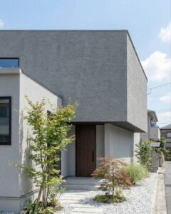 外観は、質感豊かな塗り壁と深い軒が作り出す陰影が印象的なモダンデザイン。