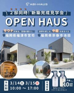 この度、お施主様のご厚意により、福岡県福津市と宗像市の2会場にて「新築完成見学会」を同時開催いたします!